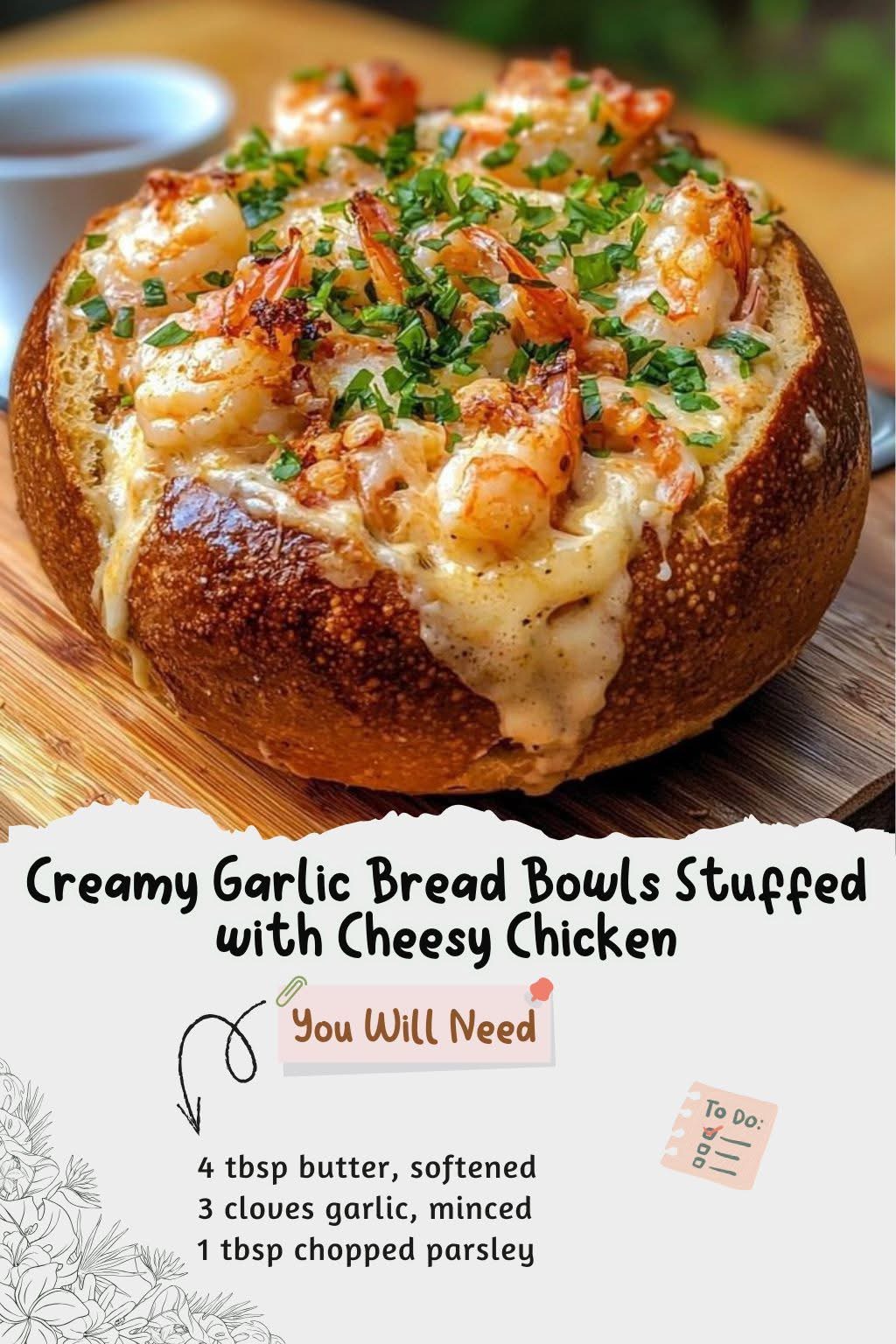 Creamy Garlic Bread Bowls Stuffed with Cheesy Chicken